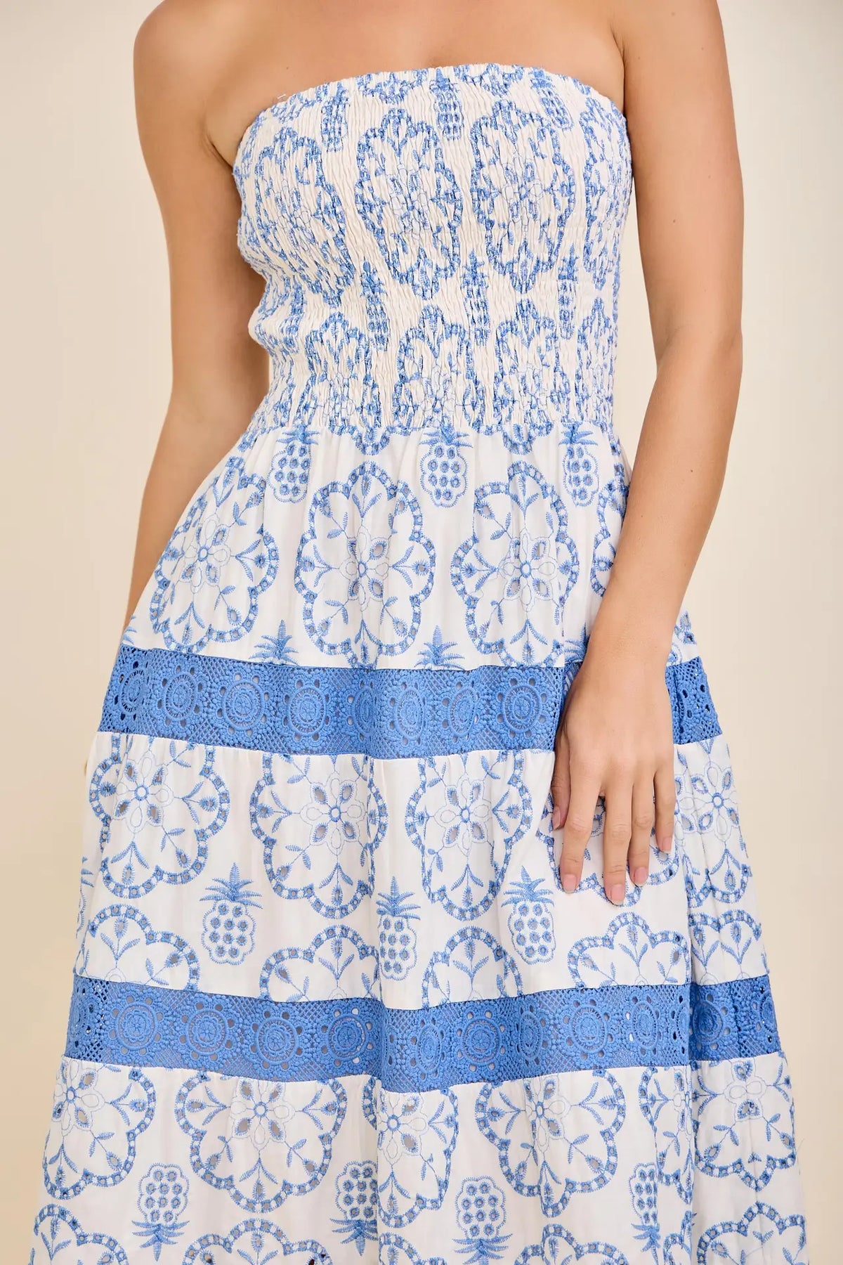 This strapless midi dress features a smocked bodice for a flattering, comfortable fit and tiered embroidered panels that add texture and movement. The rich blue floral patterns create a coastal-inspired charm, perfect for sunny getaways, brunches, or summer strolls. Effortlessly chic with a bohemian touch.