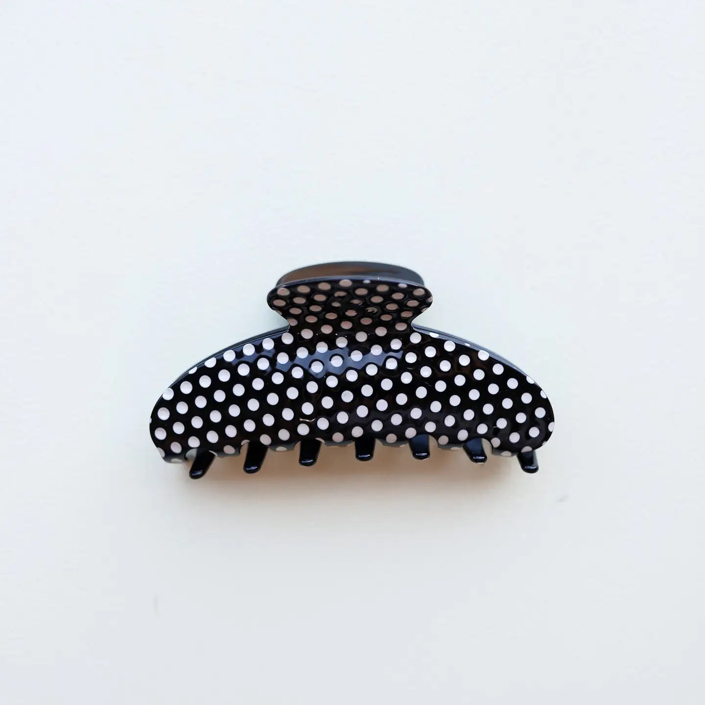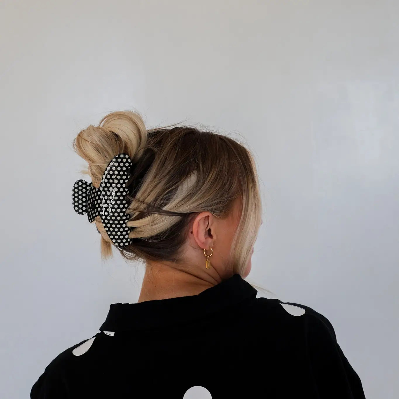 These black and white polka dot claws are EVERYTHING! This claw is functional with a strong spring and long enough to hold all your hair or wear as a half up half down