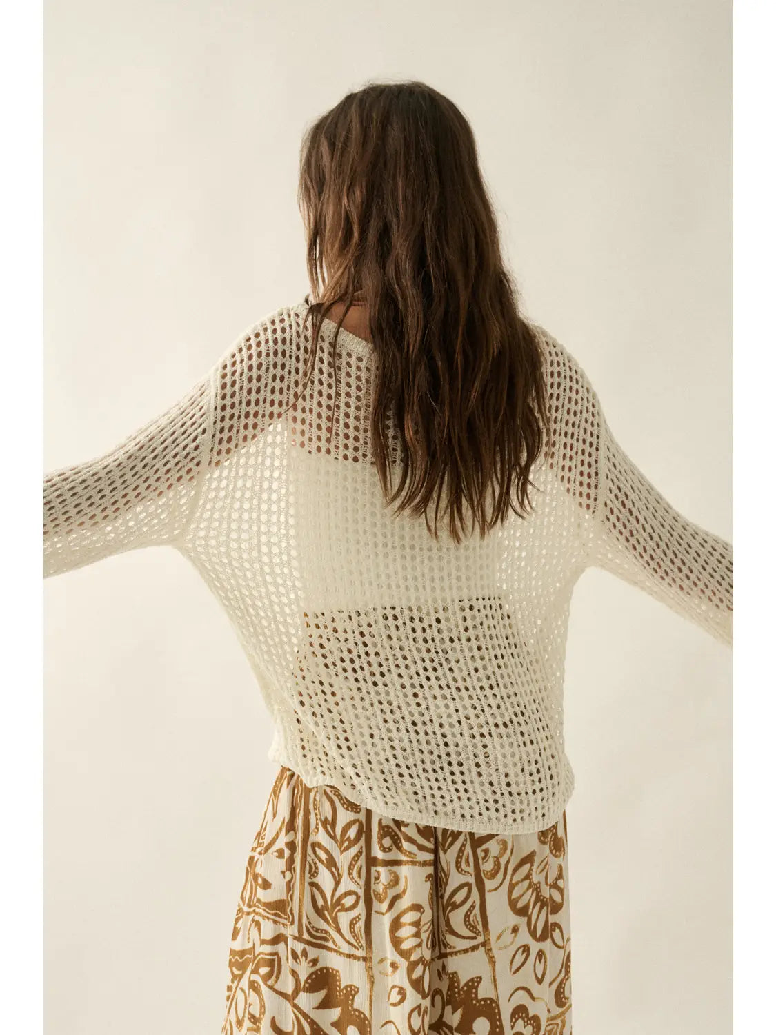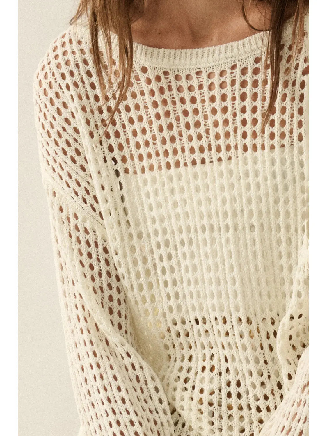 An open-knit crochet sweater with the following features: Boat neckline. Long sleeves. Drop shoulder. Ribbed knit neckline and cuffs. Unlined. Loose fit. Model Info: Height: 5 ft 9 in | Bust: 32 in | Waist: 24 in | Hips: 36 in | Wearing Size S.