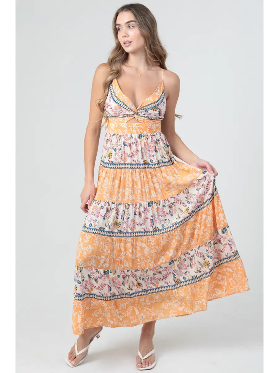 V Neck Twist Front Tiered Maxi Dress with Cut Out from Angie is a perfect blend of global lifestyle and vintage influences. Ideal for wedding guests or everyday wear, this junior size range dress features a romantic floral design adding a whimsical touch. The unique twist front and stylish cut out embody Angie's bold, poetic yet wearable aesthetic. A unique addition to any clothing collection.
