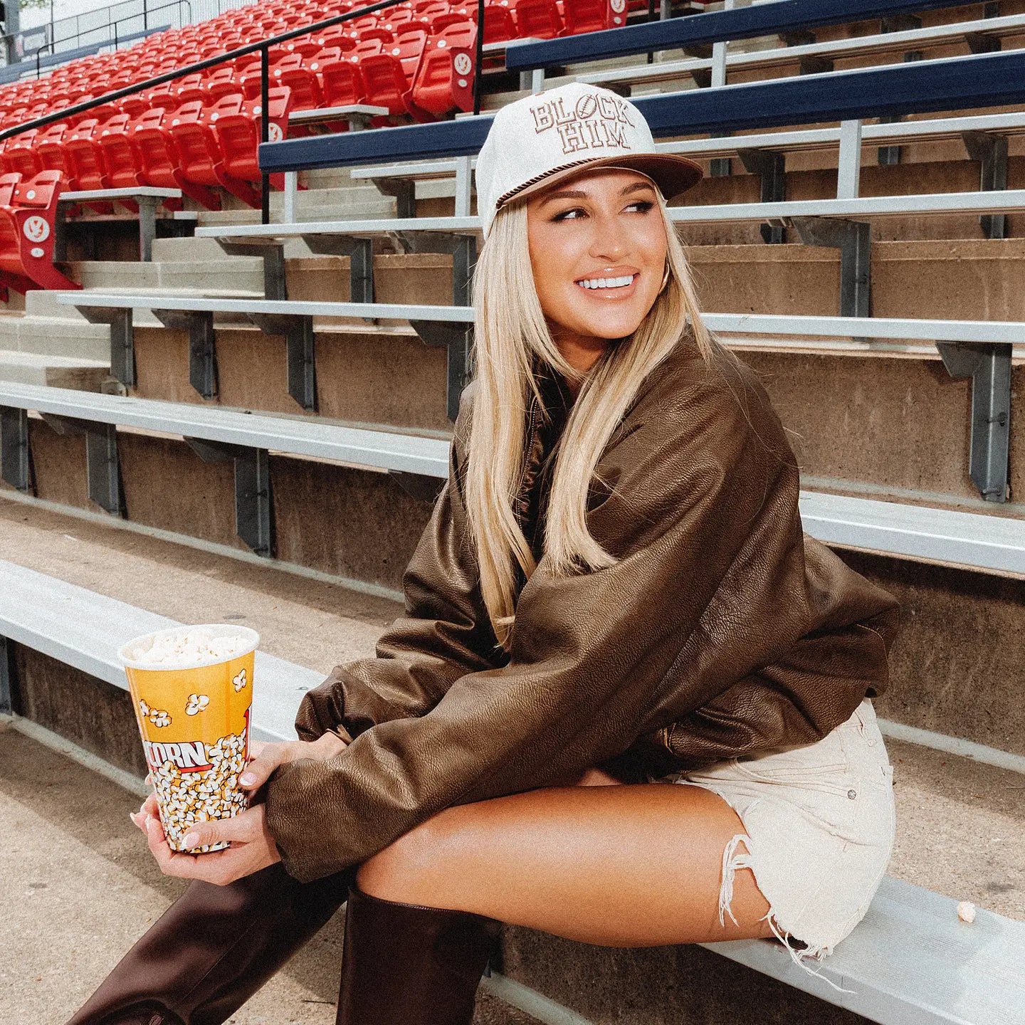 This cream cotton twill snapback trucker hat features a contrasting brown bill and bold raised embroidery that reads Block Him. With its structured fit and eye-catching design, it’s perfect for game day, weekend wear, or whenever you want to make a fun & playful statement.