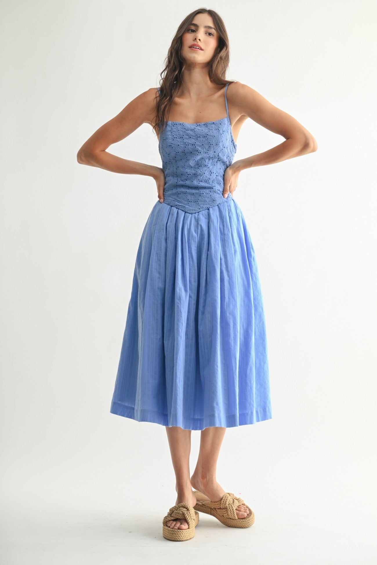 Discover the perfect blend of style and comfort with this Elegant Blue Lace Midi Dress. Designed for versatility, this dress is ideal for casual outings and special occasions alike. The intricate lace top adds a touch of elegance, while the flowy skirt offers a graceful silhouette. Experience the charm and ease of a well-crafted dress that suits any event. Model is wearing a size S Model : 5'9" - B 32" - W 24" - H 35"