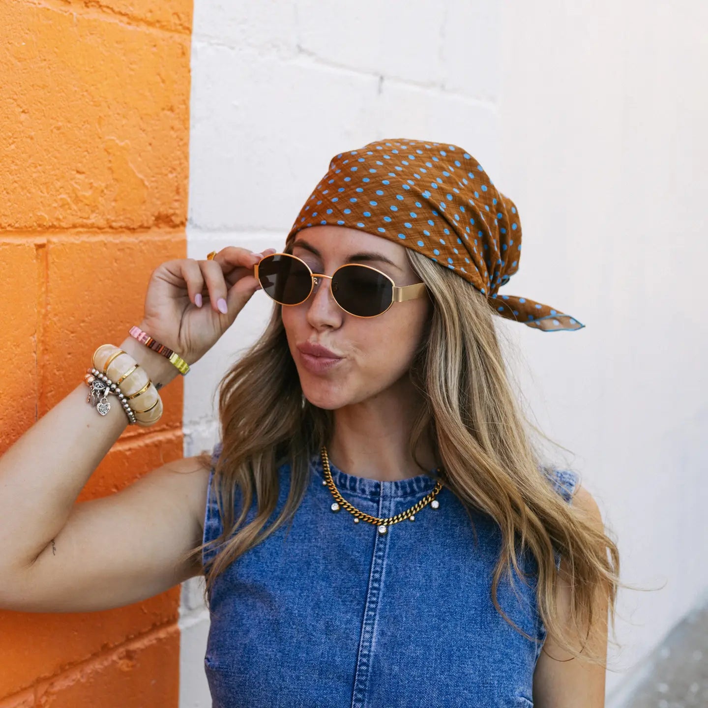 Elevate every look with your new fave accessory! These scarves are so fun to play around with -- tie on your bag for a pop of color or throw it in your hair on wash day! * Warm brown scarf with blue polka dots * 21.5" square * 66% cotton / 34% viscose * Machine wash separate