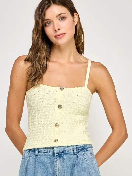 Sleeveless knit camisole top with front buttons and ribbed texture Soft yellow crop tank perfect for summer casual or vacation outfits Stretchy fitted style pairs well with jeans skirts or wide leg pants -60% POLYESTER, 40% VISCOSE