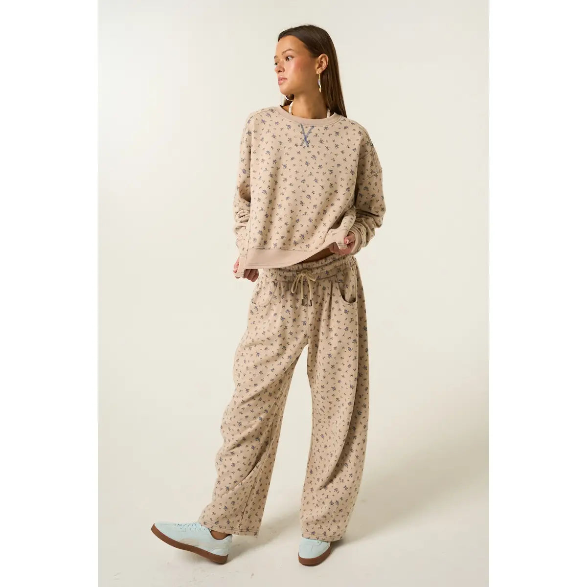 Designed with a relaxed fit and delicate floral print, this sweatshirt emphasizes laid-back comfort.The ribbed cuffs and sweep add a classic touch, while the soft fabric ensures all-day comfort. The asymmetrical sweep adds a modern touch while the soft beige color brings femininity making it a great wardrobe staple for those morning errand days. Pair it with its matching pants for a cozy-chic set. 85% cotton 15% polyester