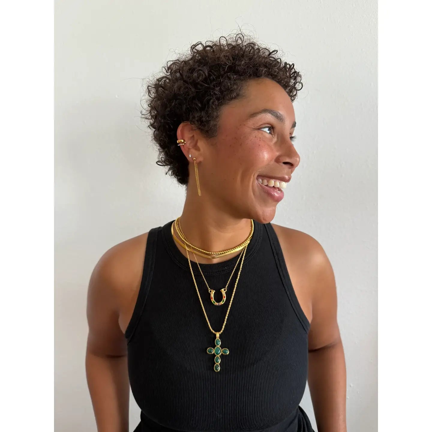 • Length: 18" + 2" extender Pendant: 1" • Waterproof • Tarnish resistant • 18K Gold plated stainless steel • Hypoallergenic