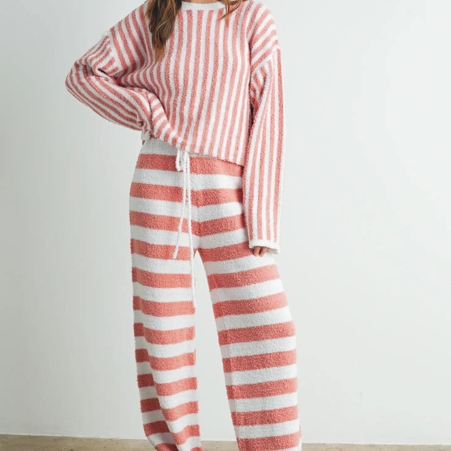 Upgrade your casual wardrobe with our Striped Drawstring Pants. These stylish pants feature a comfortable drawstring waist, allowing for a perfect fit every time. The vertical stripes add a touch of sophistication, elongating your silhouette and making them a versatile addition to any outfit. Whether you're lounging at home or stepping out for a casual outing, these pants offer the perfect blend of comfort and style. WAIST S - 13 5/8" M - 14 5/8" L - 15 5/8" HIP S - 17 1/2" M - 18 1/2" L - 19 1/2" LENGTH S - 40" M - 40 1/2" L - 41"