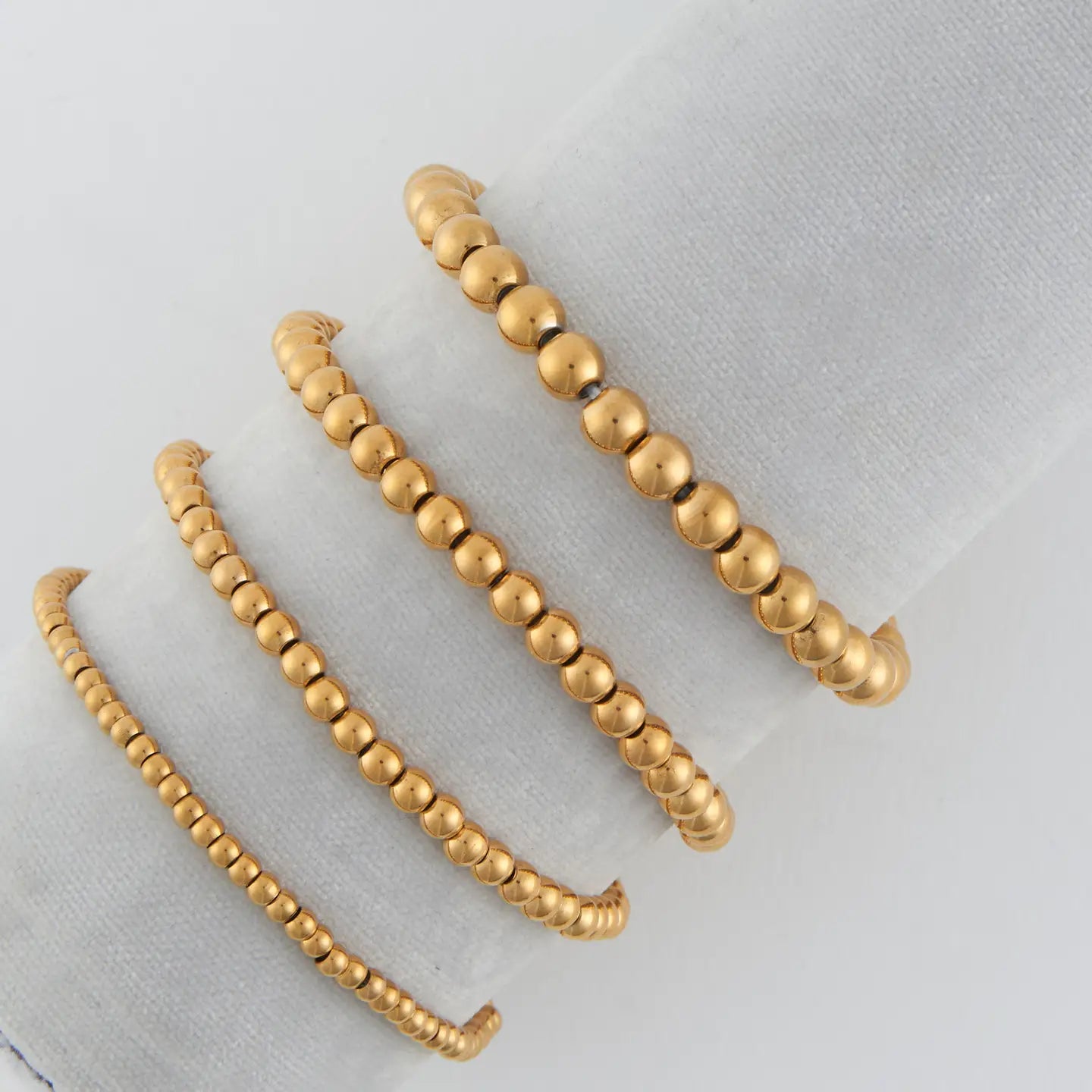 Narelle Waterproof Stackable Ball Bracelet Classic, effortless, and made to shine—the Narelle Stackable Ball Bracelet Set is your go-to for elevated everyday layering. This curated 4-piece set includes four stretch-fit beaded bracelets in varying ball sizes, all finished in luminous 18K gold plating or polished Stainless Steel. Crafted for comfort and coated with our specialized PVD technique, each bracelet is waterproof, tarnish-resistant, and built for lasting wear. Whether worn solo or styled as a complete stack, this set delivers timeless elegance with modern durability. A foundation for any wrist stack—simple, stunning, and endlessly versatile.