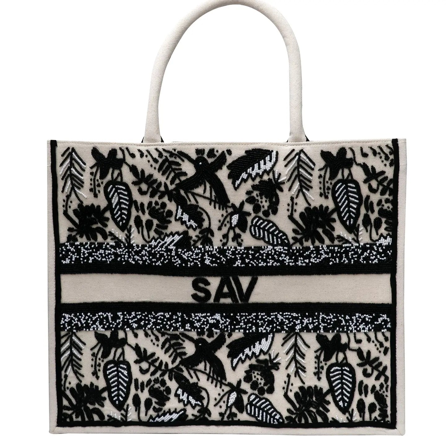 PREORDER - Custom Hand Beaded Bag: Ivory Canvas / Matte Black / Black / White