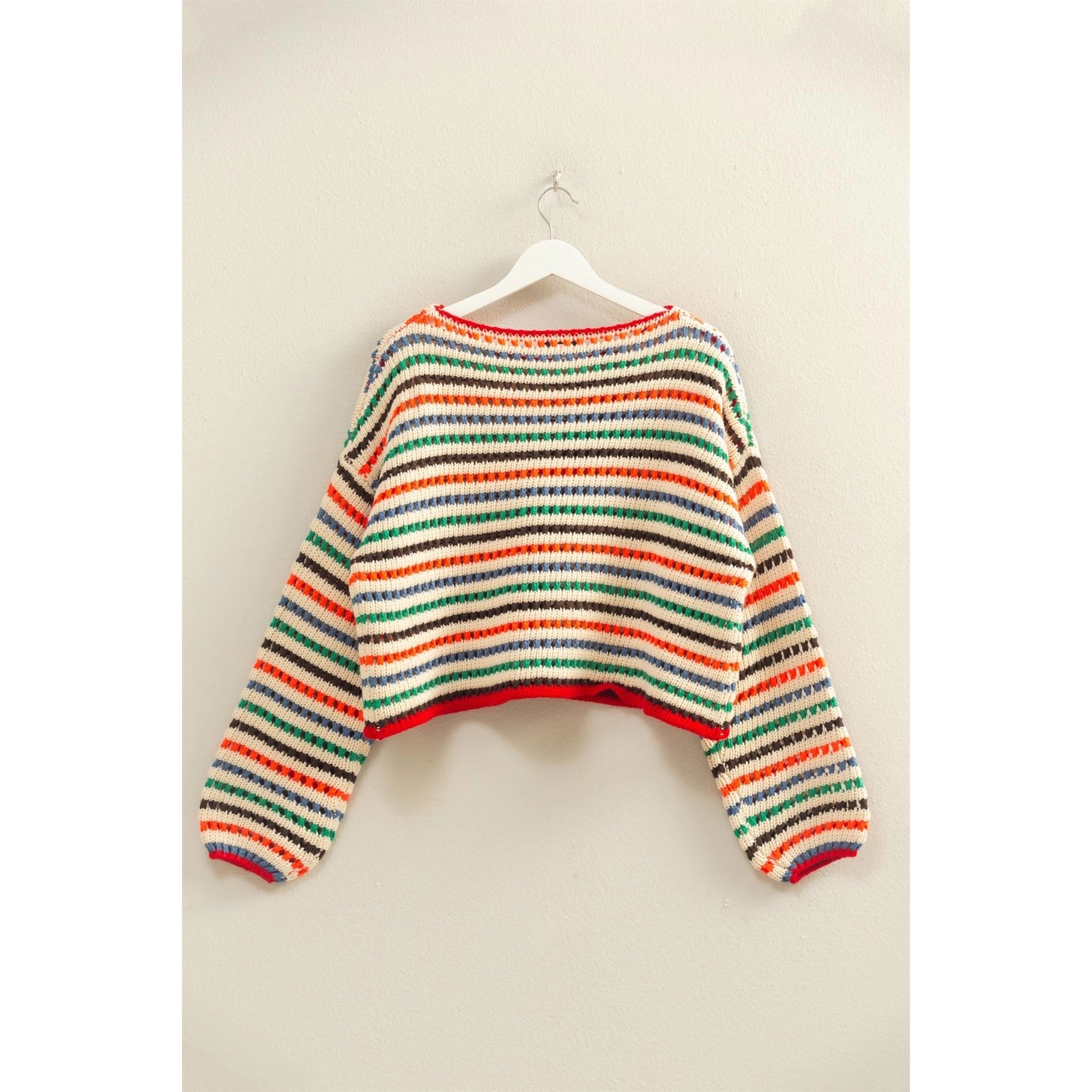 Designed for standout charm, this oversized sweater features a multi-stripe pattern, adding a vibrant touch to your wardrobe. Perfect for layering over fitted jeans or sleek leggings, it ensures comfort and style in cooler weather or casual outings. Match with ankle boots and a statement handbag for an elevated look. 100% acrylic