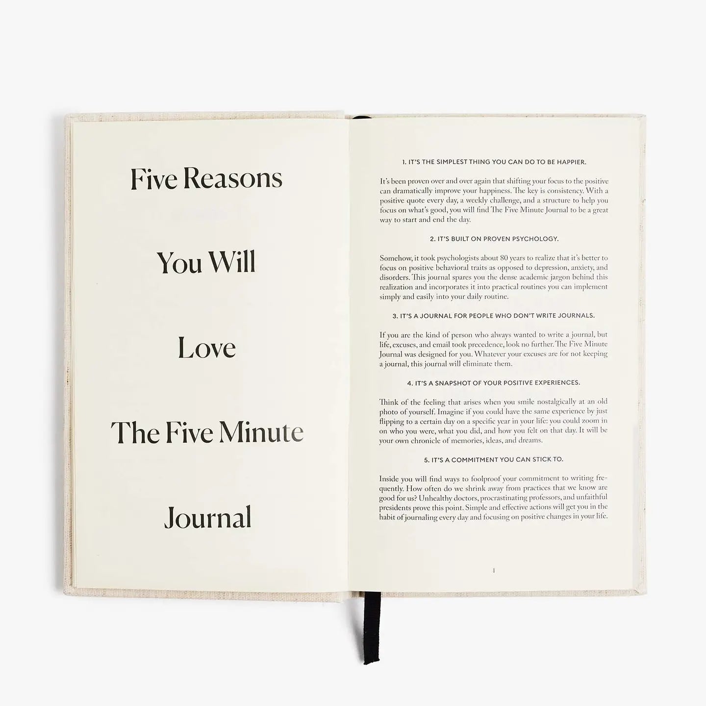 The Five Minute Journal is the original guided gratitude journal that's sold over 2 million copies. In just five minutes a day, it helps clear the mental clutter and shift focus to the good stuff. It’s straightforward, no fuss, and like a toothbrush for your mind. Whether your schedule’s packed, you’re new to journaling, or you just never know what to say, this journal is here to help. Its prompts guide you through reflecting on the positive aspects of your day, making it a simple routine to boost your mood and overall happiness. Plus, it’s designed to be as easy as possible, with a guided introduction that eases you into the habit and a clean, minimalist design that makes every page a pleasure to fill out. Undated, lasts 6 months 264 pages 100% recycled FSC paper 100% linen and cotton fabric One 100% cotton ribbon Exclusive Mocha Polka Dot