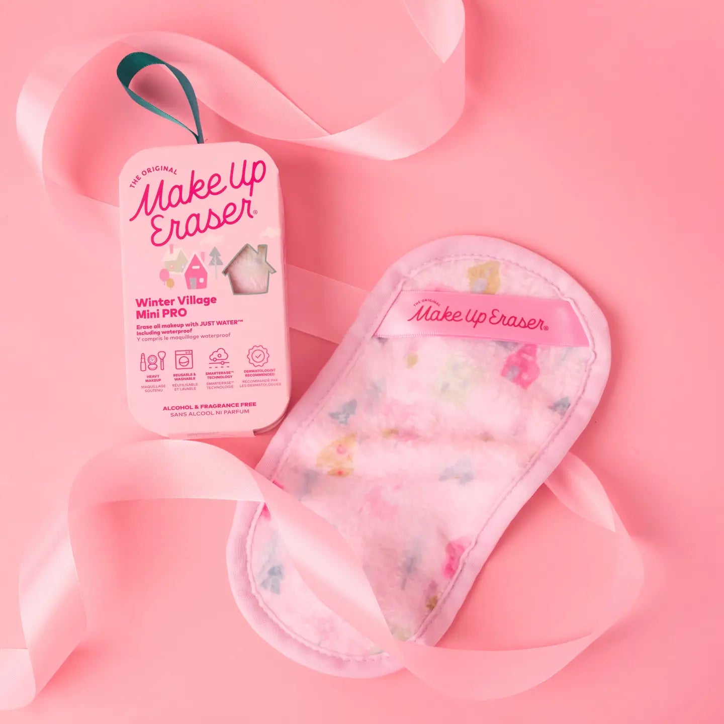 1 Mini PRO cloth 8in x 4in. Boxed with a cute ribbon for hanging on a tree. A sustainable skin care lovers gift with vintage Christmas nostalgia. This print evokes memories of collecting classic & whimsical snow villages decorated with holiday scenes. Remove all makeup with this classic Winter Village Mini MakeUp Eraser® or gift —a whimsical, winter-inspired skincare essential in a stocking or hang it on the tree like an ornament. This giftable box includes (1) reusable mini cloth adorned with charming snow village designs. This limited edition mini evokes the magic of Christmas in the City, cozy cottages, and snowy streets. It’s the perfect stocking stuffer or holiday gift for beauty lovers who value sustainability and skin health.